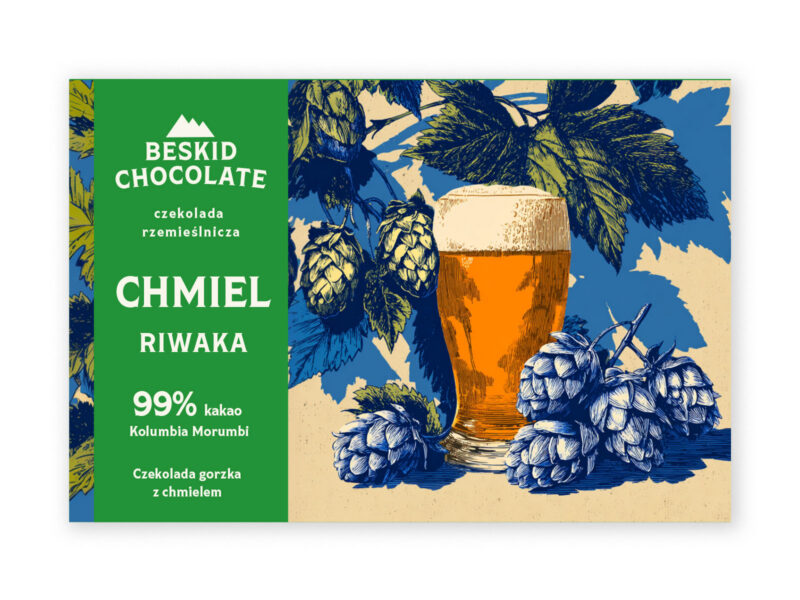 Intensywna czekolada gorzka 99% z dodatkiem aromatycznego chmielu Riwaka. Wytrawna, głęboka, z wyraźnymi nutami cytrusów i żywicy – dla prawdziwych fanów mocnych smaków.