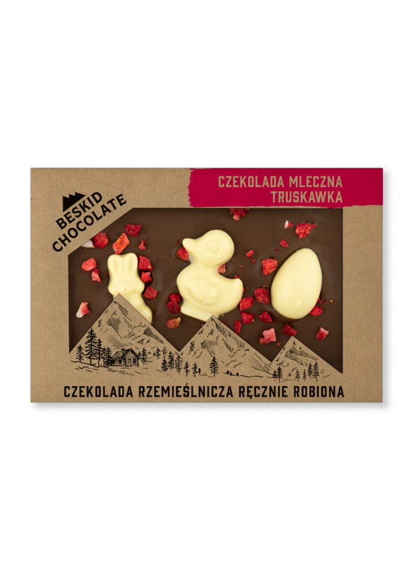 Mamy przyjemność zaprezentować naszą wyjątkową tabliczkę czekolady mlecznej z dodatkiem pysznych owoców i ozdobioną ręcznie wykonanymi figurkami wielkanocnymi z białej czekolady. Nasza czekolada jest wykonana z najwyższej jakości składników, co gwarantuje nie tylko wspaniały smak, ale także intensywny aromat. Dodatek owoców nadaje tabliczce lekkiej słodyczy i sprawia, że każdy kęs jest prawdziwą przyjemnością. Ręcznie wykonane figurki z białej czekolady dodają elegancji i uroku całej prezentacji. To idealny wybór na prezent dla najbliższych, jak również jako element dekoracyjny wielkanocnego stołu.