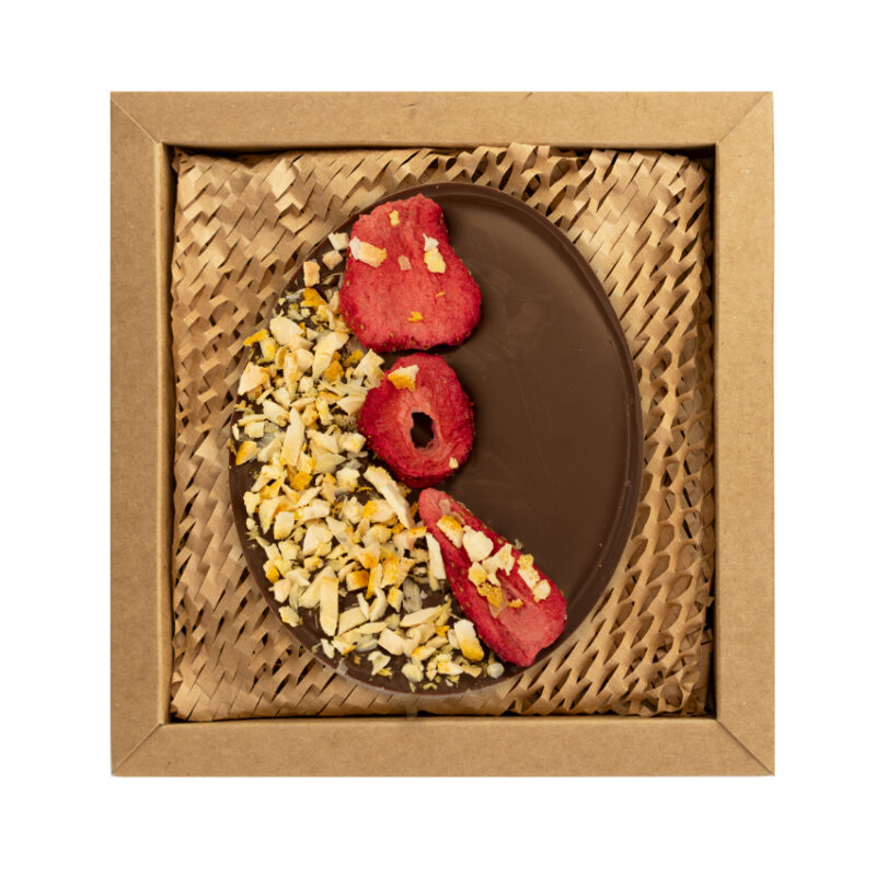 Rzemieślnicze czekoladowe jajko wielkanocne z mlecznej czekolady 42% kakao tworzonej metodą bean to bar. Kremowa słodycz harmonijnie łączy się z liofilizowaną truskawką i pomarańczą, nadając całości owocowej świeżości. Idealny prezent na Wielkanoc dla miłośników prawdziwej czekolady.