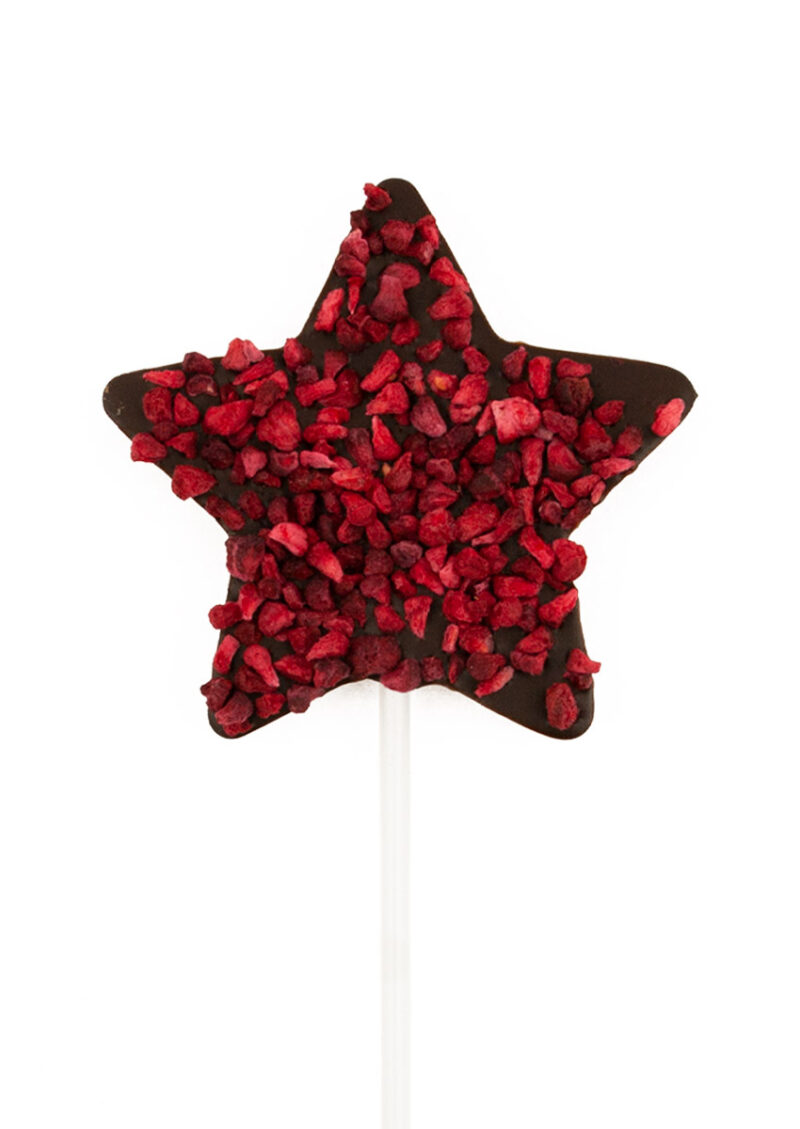 Lizak w kształcie świątecznej gwiazdki z czekolady ciemnej z malinami