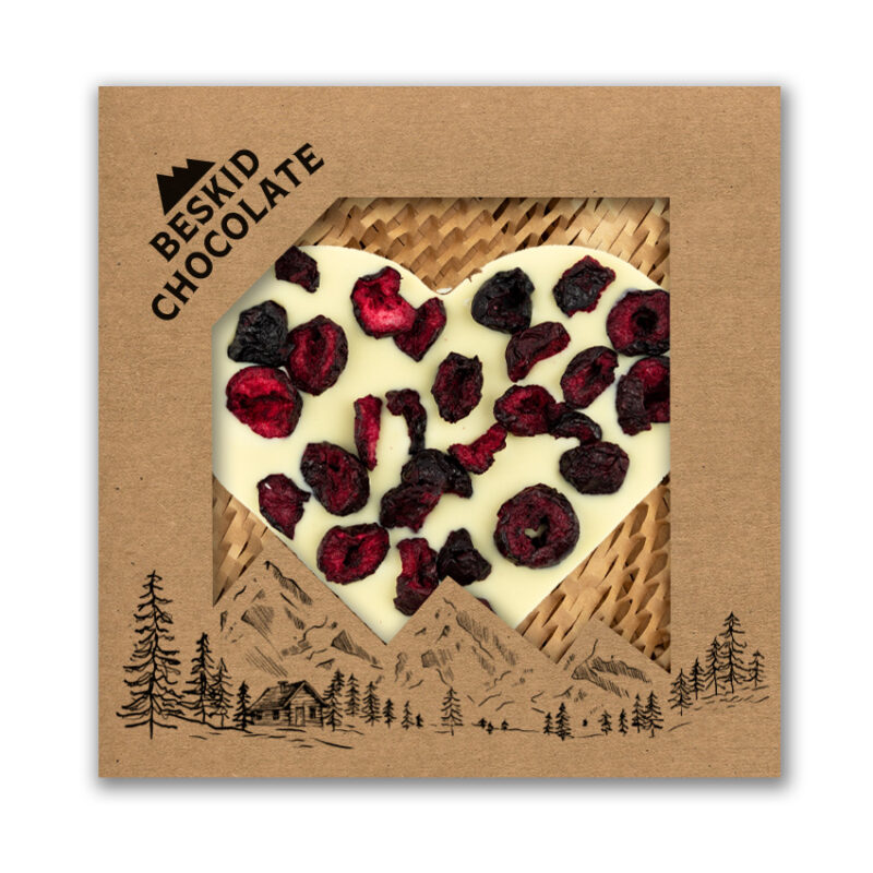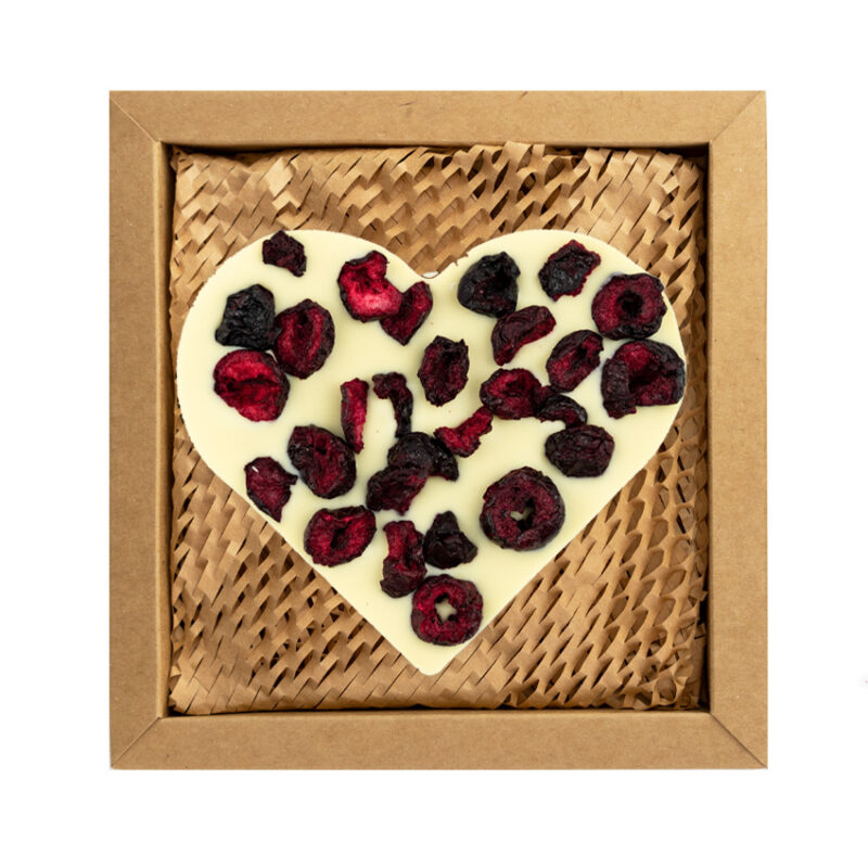 Serce z czekolady białej z dodatkiem wiśni liofilizowanych. Pakowane w estetyczne pudełko z kartonu kraft wypełnione „eko wiórkami”.