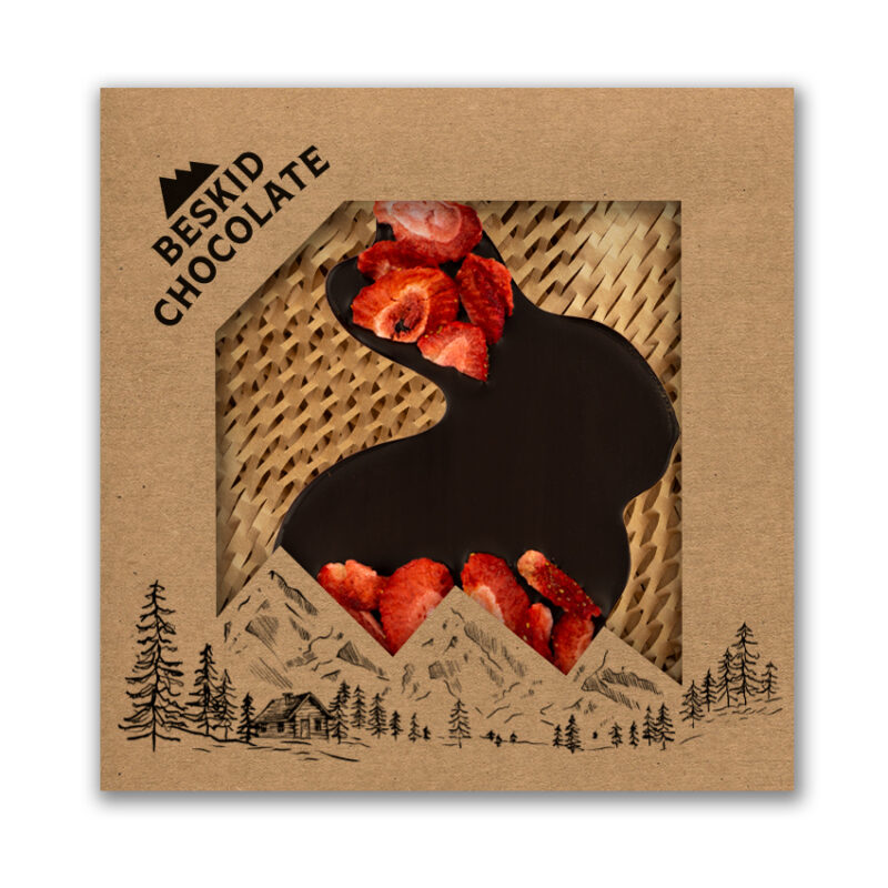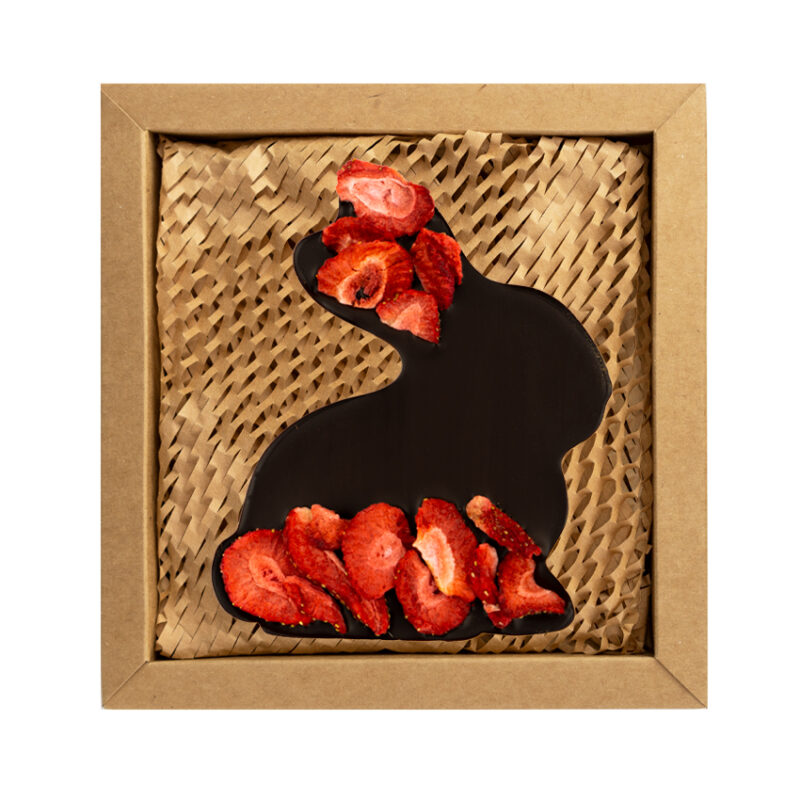 Elegancki wielkanocny zajączek z gorzkiej czekolady bean to bar, wzbogacony chrupiącymi liofilizowanymi truskawkami. Powstał z aromatycznych ziaren kakao, by zachwycać intensywnym smakiem. Zapakowany w stylowe kraftowe pudełko – idealny na świąteczny upominek.